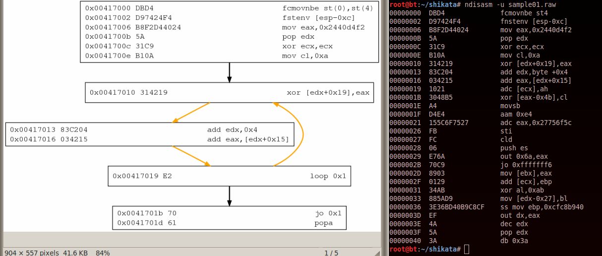 root@bt:~/shikata# cat sample_5_rounds.raw | ~/libemu/libemu/tools/sctest/sctest -vvv -Ss 100000 -G Exec01_5_rounds.dot